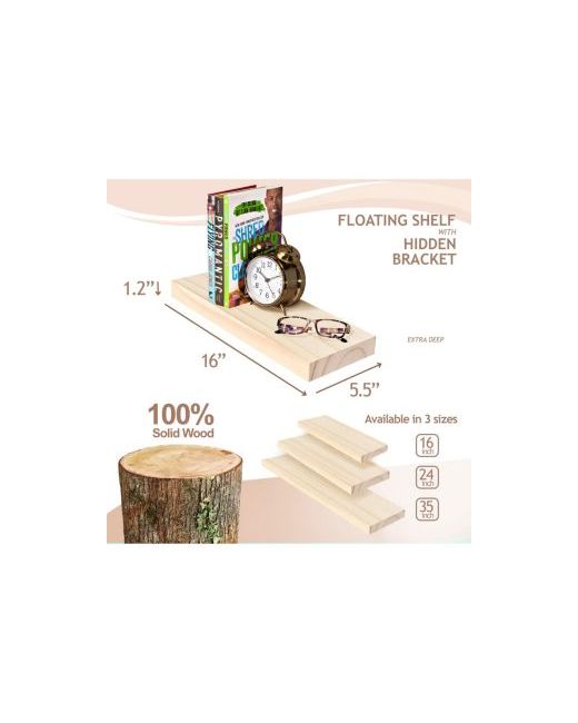 Upgrade your space with solid pine wood floating shelves that add modern rustic style to any room. Made from 100% genuine wood, these durable shelves support over 20 lbs per shelf and feature natural wood grain and knots. The heavy-duty stainless steel brackets ensure stability, perfect for use as bathroom shelves, bedroom wall shelves, or floating book shelves. A moisture-resistant wax coating preserves the rustic wood finish, even in humid spaces. Easy to install with hidden brackets and included hardware.