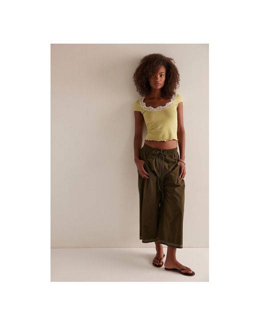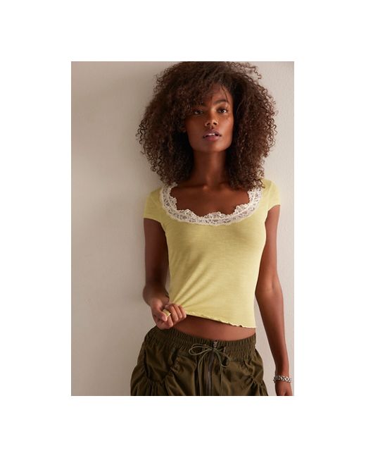 Intricate lace adorns the neckline of this flattering tee from Intimately, featuring a wide square neckline with capped short sleeves and lettuce-edge trim. **Fit:** Fitted, semi-cropped **Features:** Micro-ribbed cotton blend, square neckline, lace trim at neck, capped short sleeves, lettuce-edge hem **Why We ❤ It:** A forever femme styling option to layer under jackets and more. Oh My Darling Tee by Intimately at Free People in Whispering Willow, Size: XS