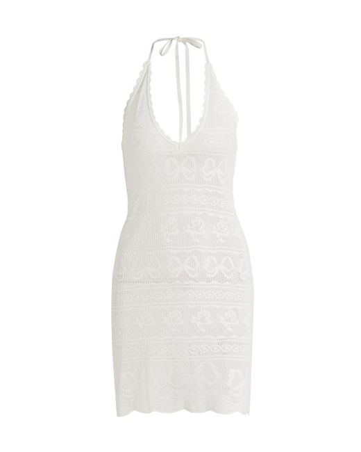 LoveShackFancy's Laurelin halterneck minidress is crafted of lace with ribbon and floral motifs, and styled with scalloped trim. Halterneck Sleeveless Back tie closure 77% viscose/23% nylon Machine Wash Imported SIZE & FIT About 32.5" from shoulder to hem Model measurements: 5'10" tall Model is wearing US size Small. Contemporary Sportswear - Trend > Loveshackfancy > Saks Fifth Avenue > Barneys. LoveShackFancy. Color: Ivory. Size: XS.