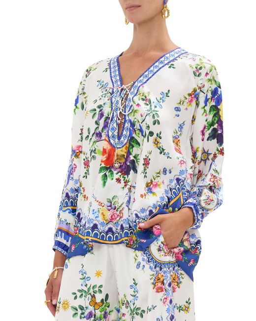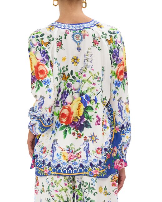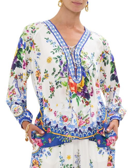 From the Tiles Darls Collection. Crafted of silk, this Camilla blouse is adorned with an intricate floral motif. The plunging split neck is detailed with self-tie drawstrings. Plunging split neck, self-tie drawstrings Long puff sleeves, elasticzed cuffs Pulls over 100% silk Hand wash Imported SIZE & FIT Model measurements: 5'10" tall Model is wearing a US size Small. Outerwear And Swimwear - Contemporary Swim > Camilla > Saks Fifth Avenue > Barneys. Camilla. Color: Tiles Darls. Size: Medium.