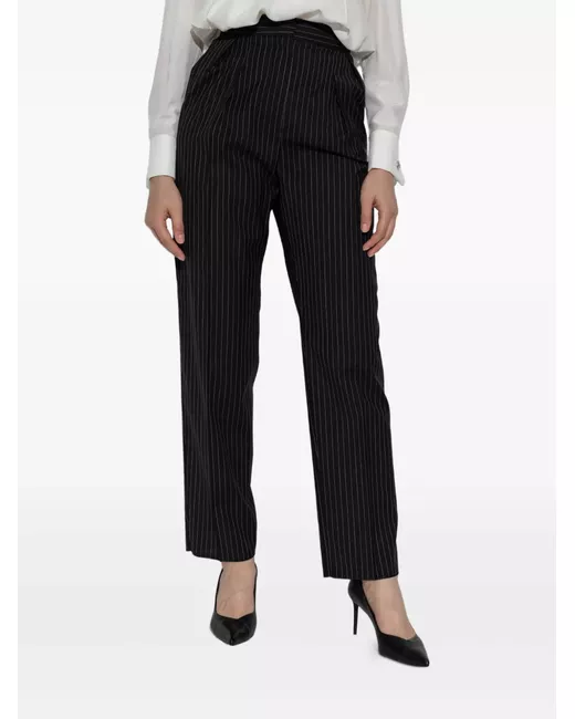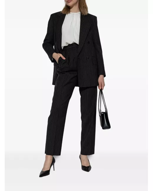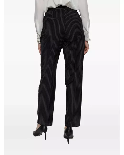 black vertical pinstripe pattern pleated front detailing tapered leg concealed fastening side pockets
