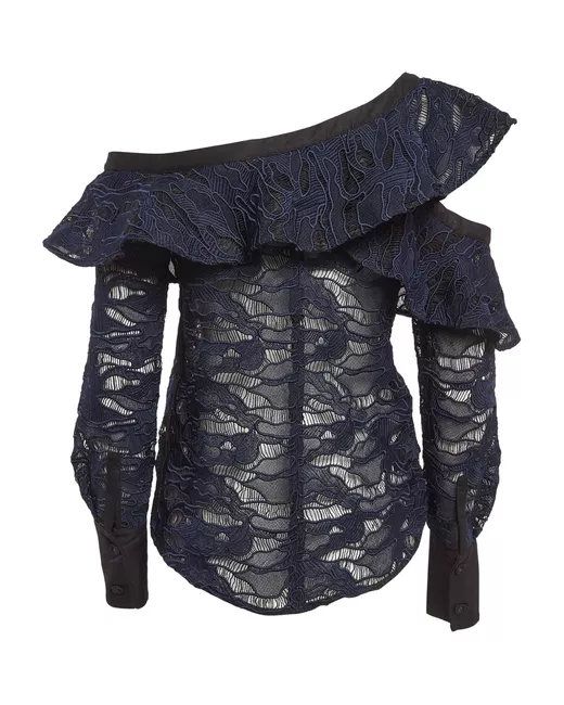 navy blue lace overlay ruffled detailing long sleeves Condition: GOOD. This previously owned and used item is in good condition with minimal signs of use. This may include fading of material or plating and scratches.