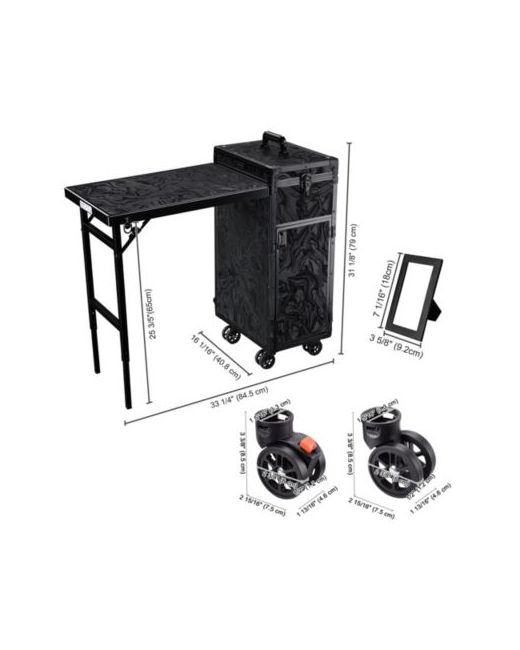 Specifications:- Nail Table:- Expanded Overall Dimension(LxWxH) 33 1/4" x 16 1/16" x 31 1/8"- Folded Overall Dimension with Wheels(LxWxH) 15 1/16" x 12" x 30 11/16"- Table Expanded Dimension(LxWxH) 22 7/16" x 15 1/16" x 27 9/16"- Mirror Size(LxW) 7 1/16" x 3 5/8"- Table Load Capacity 15.4 Lbs- Each Drawer Load Capacity 11 Lbs- Net Weight: 30.2 Lbs- Replacement Wheels:- Overall Dimension (LxWxH): 2 15/16" x 1 13/16" x 3 3/8"- Wheel Dia.: 2 3/8"- Unilateral Thickness: 1/2"- Wheels Net Weight: 0.33 Lbs- Lockable Wheels Net Weight: 0.44 Lbs. Package Contents:- 1x Trolley Case- 4x Drawers- 1x Independent Case- 4x Keys- 4x Wheels- 1x Scarf- 1x Manual- 4x Replacement Wheels