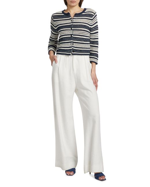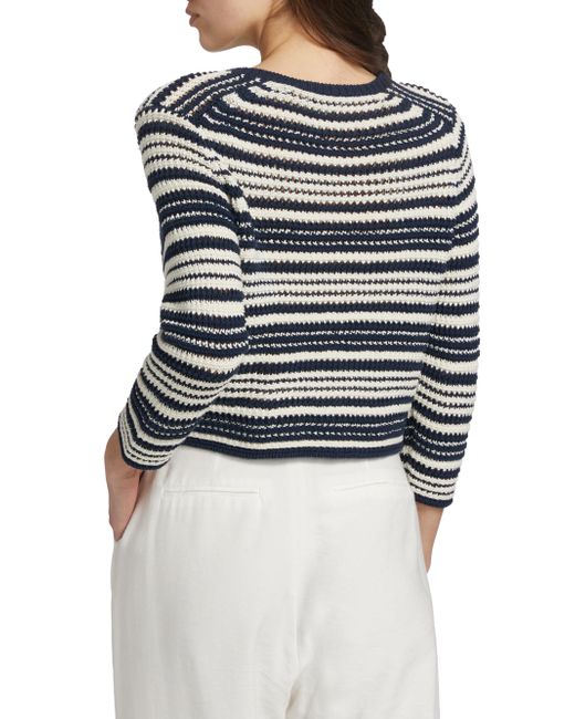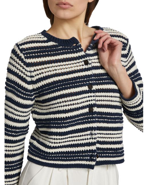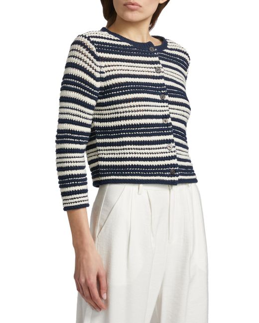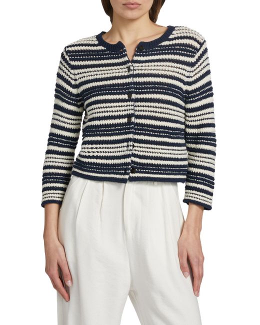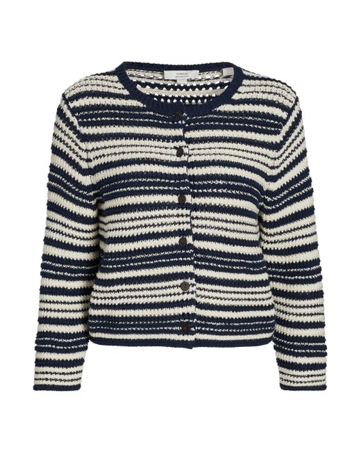 Finished in a textured stripe, Vince's cardigan features a crewneck, light cotton design, and three-quarter sleeves. Crewneck Three-quarter sleeves Button-front closure 100% cotton Hand wash Imported SIZE & FIT Model measurements: 5'10" tall Model is wearing a US size Small. Contemporary Sportswear - Vince > Vince > Saks Fifth Avenue > Barneys. Vince. Color: Navy Off White. Size: Large.