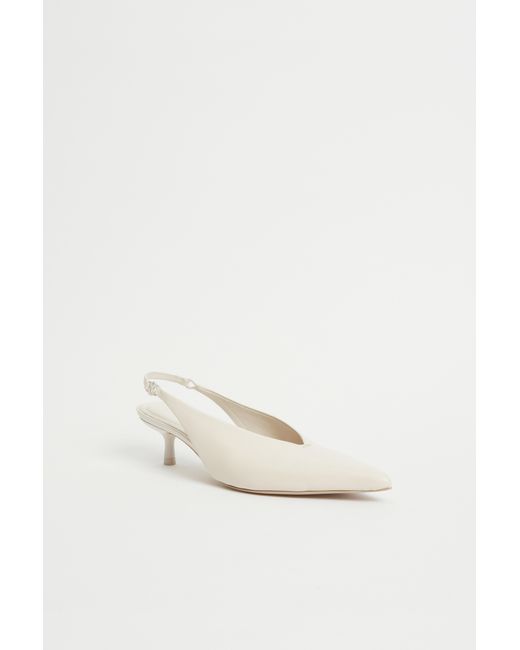 SPRING 2025 WOMEN'S COLLECTION The Sylvie Slingback Kitten Heel in Sand. This sophisticated slingback kitten heel features a pointed toe and streamlined silhouette, exuding understated elegance. SIMKHAI Women's Sylvie Slingback Kitten Heel in Sand, Size 36