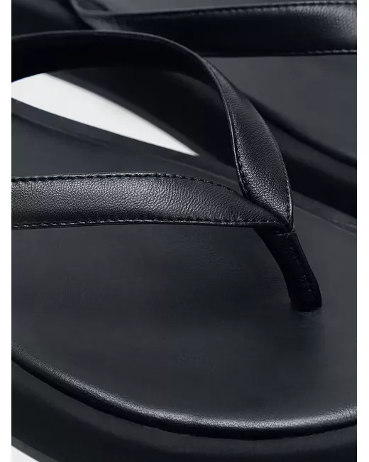black leather debossed internal logo thong strap open toe slip-on style flat rubber sole