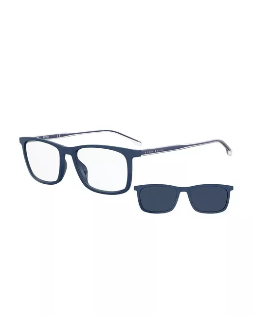 dark blue rectangle frame clip-on lenses clear lenses temple branding matte finish These glasses come with a protective case. All glasses from FARFETCH are sold as non-prescription frames.