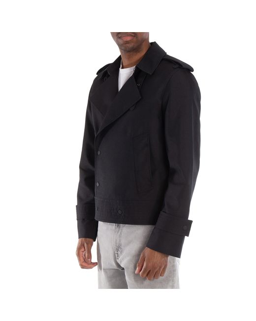 Burberry Mens Outerwear. Fashion category: Coats & Jackets. SKU: 8087329. Material: Polyester;Silk;Viscose. Color: Black. Burberry Double-Breasted Long Sleeved Jacket. This silk-blend jacket features a falling lapel, shoulder boards, double-breasted button closure, two side flap pockets, long sleeves with button cuffs, a straight hem, and a cropped design. Outer material: 60% Silk, 40% Polyester, Lining: 100% Viscose. Made in Italy.
