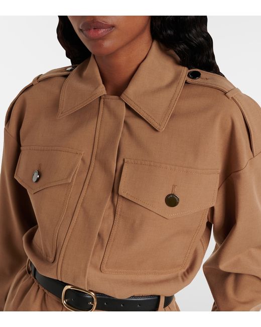 Material: 82% polyester, 10% lyocell, 6% wool, 2% elastane. Care instructions: dry clean. Made in China. Designer color name: Beige. Item color: beige. Lining: 100% cupro. Material II: 100% polyurethane. Material III: 100% polyamide. Details: 100% cow leather. Closure: partially zipped front. Elasticated waistband. Detachable belt. Pockets: buttoned pockets. Cuff: three buttons.