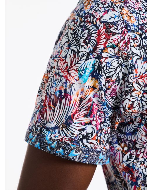 An allover multi-colored print gives a fresh take to a basic knit button down. Take a closer look and notice the intricate floral design that blooms across this shirt. You'll love the subtle detailing of this multi-hued style. Point collar Full button front placket Allover floral print Contrast print at collar and sleeve Short sleeve Shirttail hem 95% cotton, 5% spandex Machine wash cold Imported