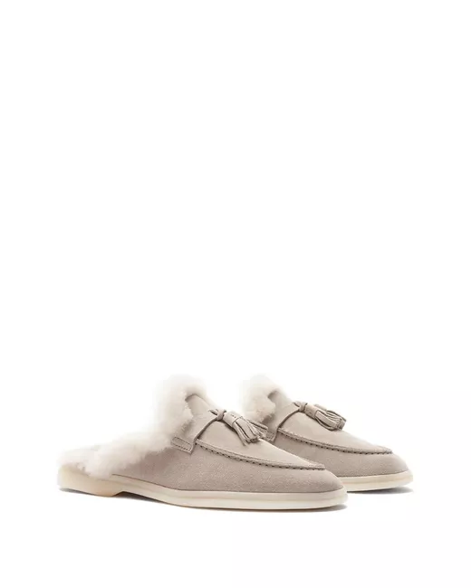 sand beige suede tassel detail moc stitching almond toe shearling lining flat rubber sole