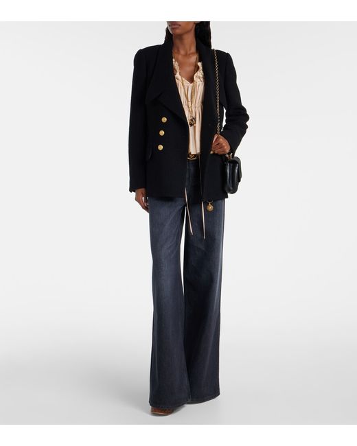 Material: 89% wool, 10% polyamide, 1% elastane. Care instructions: dry clean. Made in Slovakia. Designer color name: Black. Item color: black. Lining: 100% silk. Details: 100% water-buffalo horn. Contains non-textile parts of animal origin. Blazer. Closure: double-breasted (six buttons). Pockets: flap pockets. Cuff: four buttons. Vent: no vent. Hardware color: gold. Wool.