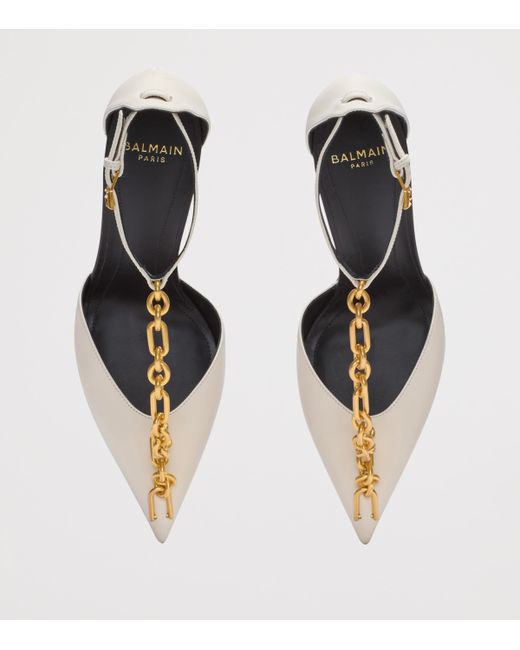 Balmain's Autumn/Winter 2025 collection revisits Olivier Rousteing's tenure as creative director, reflecting on his 14-year journey marked by resilience, boldness and innovation. The Sync collection introduces a fresh aesthetic that pays homage to the brand's utilitarian codes from the 1950s and 1960s. These leather mules, in particular, are distinguished by a chunky gold-tone chain that anchors the strap to the vamp, turning function into a statement.