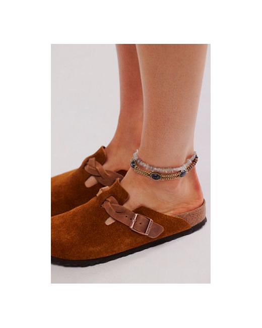 An effortless staple gets a twist with these beloved mules from Birkenstock, featured in their signature Boston design with soft suede uppers and a braided strap for a dose of detail. **Features:** Slip-on style, backless design, round toe, suede uppers, contoured cork-latex footbed, suede footbed lining, EVA sole, braided strap with adjustable metal pin buckle **Why We Birkenstock Boston Braid Clogs at Free People in Mink Suede, Size: EU 38