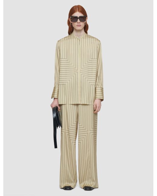 The Athena Geometric Print Silk Blouse is a relaxed fit style. Crafted from a blend of silk and viscose for a lustrous and fluid look. This blouse features an understated geometric pattern. Its stand collar, hidden placket and wide cuffs deliver a clean, elegant look.
