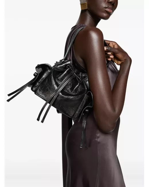 black calf leather drawstring closure ruffled detailing detachable shoulder strap heart-shaped logo tag