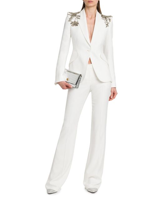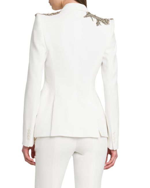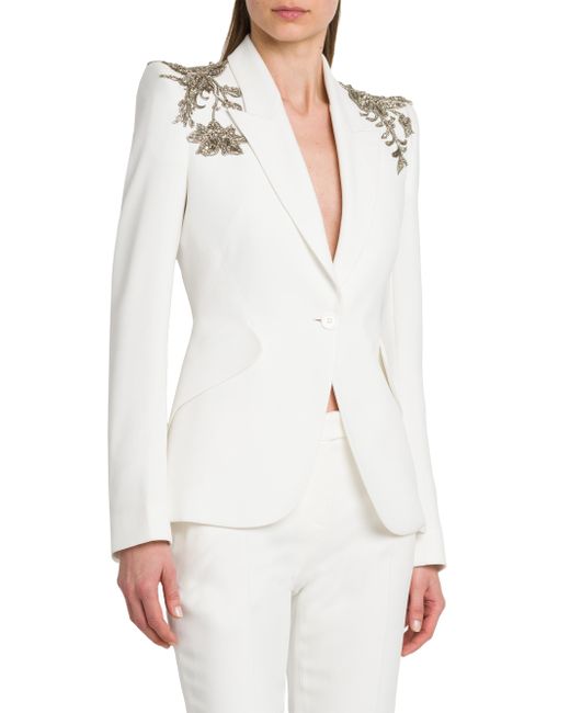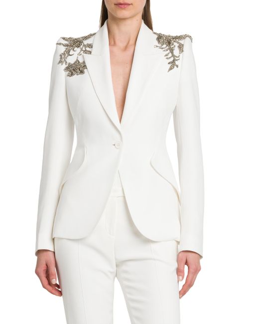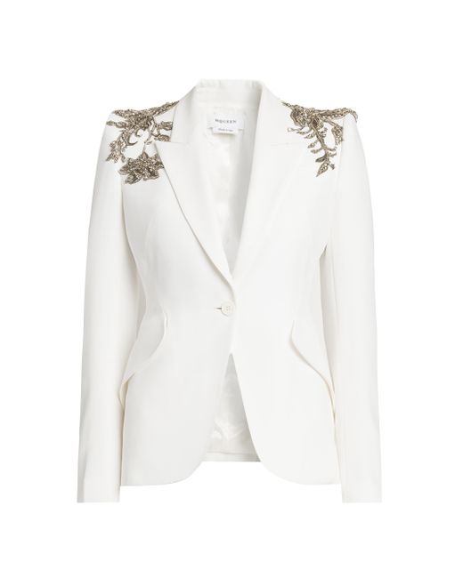 This McQueen jacket features floral embellishments at the shoulders. This single-breasted piece is styled with peak labels and side flap pockets. Peak lapel Long sleeves, button cuffs Side flap pockets Singe-button closure 52% viscose/48% acetate Dry clean Made in Italy SIZE & FIT Model measurements: 5'10" tall Model is wearing US size 4 ABOUT THE BRAND Visionary designer Lee Alexander McQueen launched his brand in 1992, which quickly became synonymous with cutting-edge, avant-garde design. Creative Director Seán McGirr has continued the designer's legacy, bringing precision craftsmanship and a feminine vision to the label's signature edge. Advanced European - Alexander Mcqueen > Mcqueen > Saks Fifth Avenue > Barneys. McQueen. Color: Light Ivory. Size: 0.