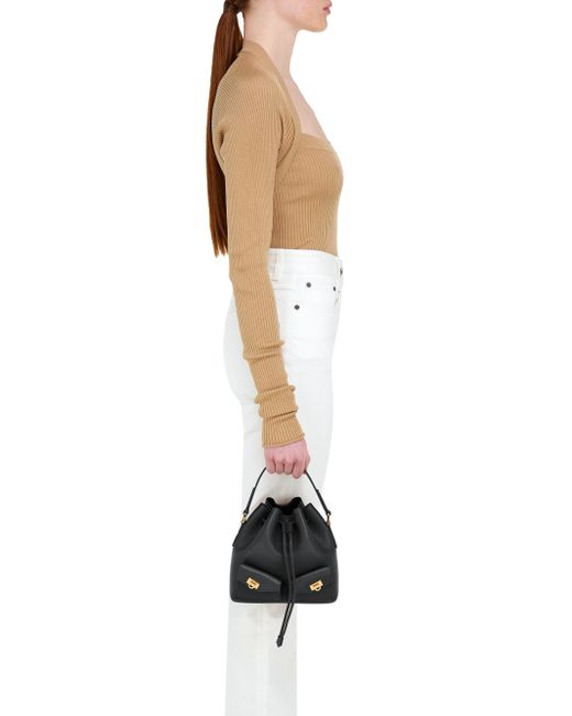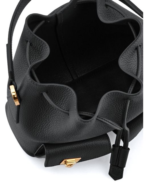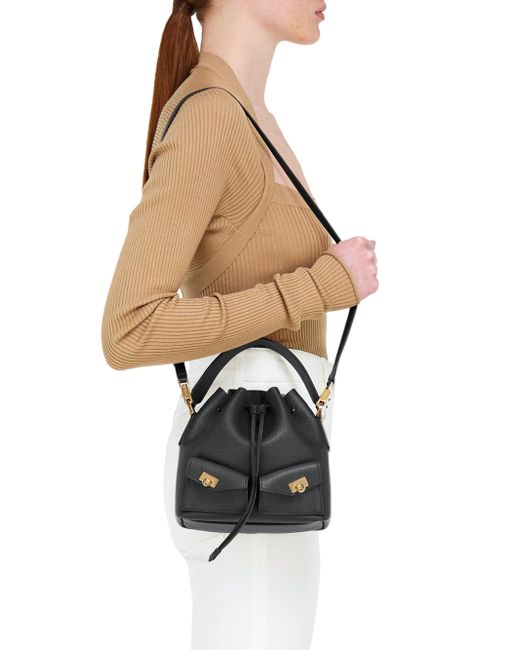 Accented with goldtone hardware, this chic bucket bag from FERRAGAMO is crafted of leather. Top handle Exterior: two flap pockets Drawstring closure Leather Lined Made in Italy SIZE About 7.5"W x 4.5"H x 7.75"D ABOUT THE BRAND Italian designer Salvatore Ferragamo began his journey in 1927 in Italy with a vision of creating the world's most beautiful shoes. Since its inception, Ferragamo has expanded to include clothing, accessories and beauty under the creative direction of Maximilian Davis-who brings a minimalist-meets-maximalist aesthetic to the brand. Handbags - Ferragamo Handbags > Ferragamo > Saks Fifth Avenue > Barneys. FERRAGAMO. Color: Nero.