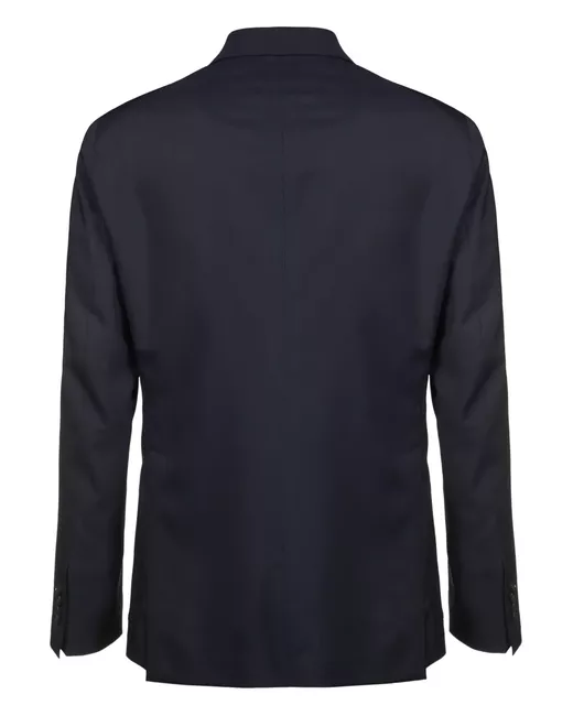 dark blue double-breasted closure peak lapels patch pockets long sleeves button cuffs