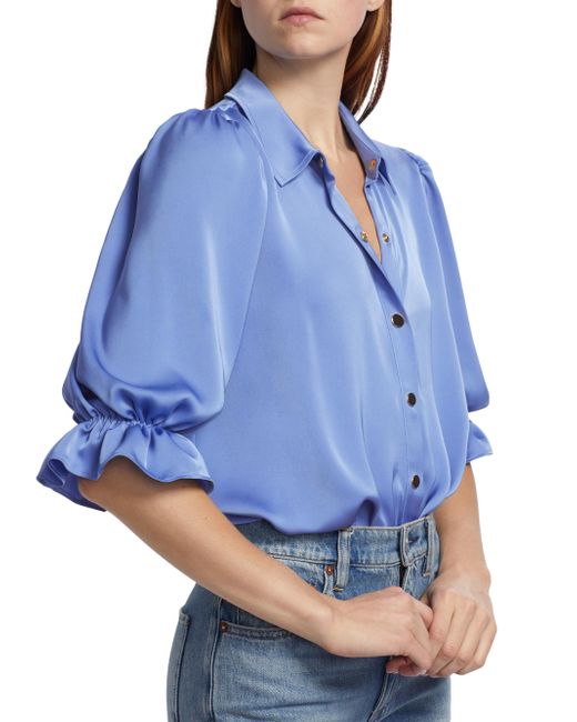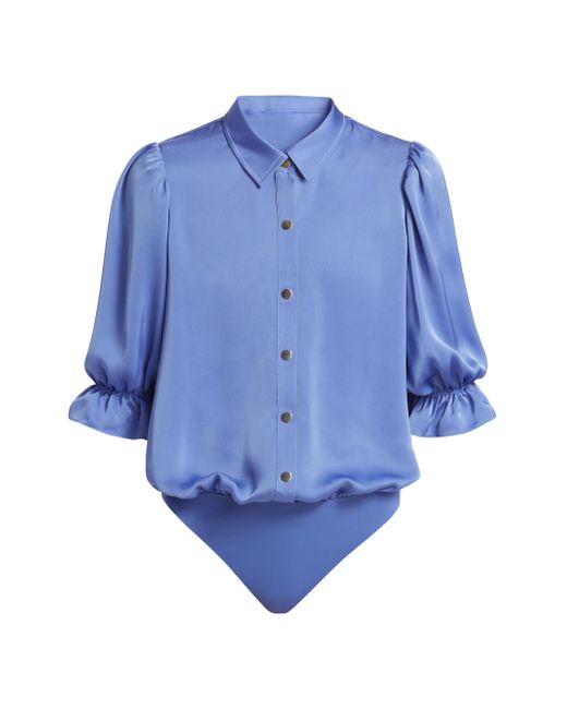 Ramy Brook's Dina bodysuit showcases a billowing bodice tailored with a point collar and flared cuffs. Framed by elbow-length sleeves, this piece features a shiny snap front design. Point collar Elbow-length sleeves, elasticized flare cuffs Shirred back yoke Snap front closure 100% polyester Dry clean Imported SIZE & FIT About 25" from shoulder to hem Model measurements: 5'10" tall Model is wearing a US size Small. Contemporary Sportswear - Contemporary Collections > Ramy Brook > Saks Fifth Avenue > Barneys. Ramy Brook. Color: Cornflower Blue. Size: XXS.