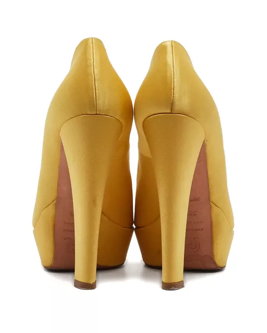 yellow satin peeptoe platform sole high block heel Condition: GOOD. This previously owned and used item is in good condition with minimal signs of use. This may include fading of material or plating and scratches.