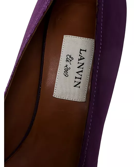 purple canvas peep toe cork platform sole high cork heel raw edge detail at topline Condition: GOOD. This previously owned and used item is in good condition with minimal signs of use. This may include fading of material or plating and scratches.