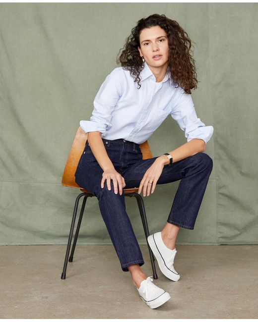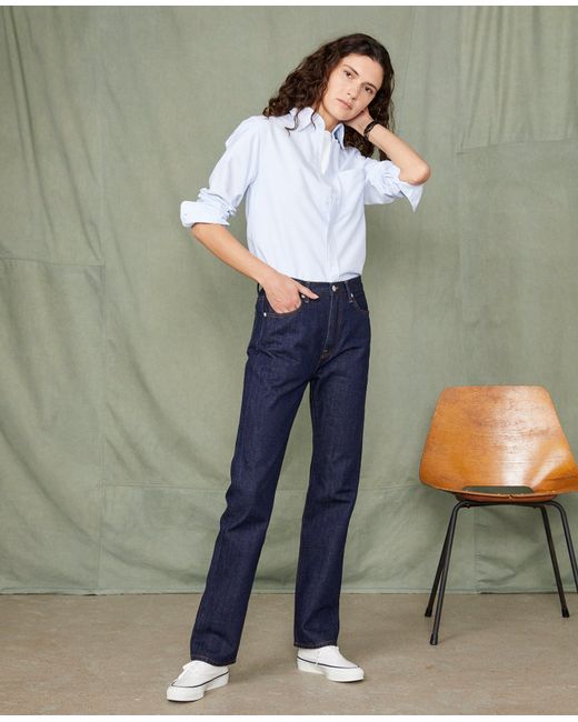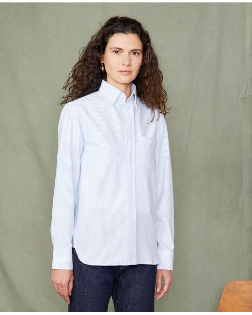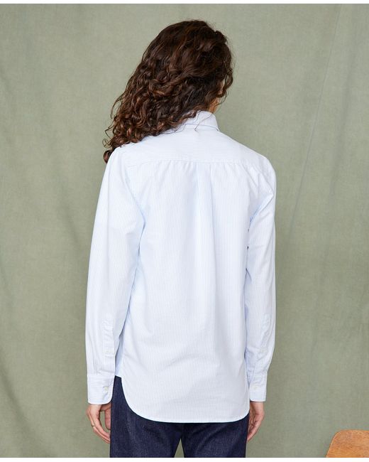 Long sleeves cotton oxford shirt with buttoned collar. Two pleats at cuffs. Signature asymetrical chest pocket. Applied topstitched placket. Slightly round bottom with side gussets. Back topstitched yoke with two pleats. Light blue and white candy stripe, made from italian cotton oxford.|• 100% cotton • Regular fit • Butttoned Shirt collar • Topstitched cuffs • Applied topstitched button placket • Round bottom with side slits • Signature asymetrical chest pocket • Japanese candy Stripe cotton oxford •Machine washable with similar colors, 30°. •Made in Portugal |Man: This product sizes normally, we advise you to take your usual size. Woman: We recommend to take two sizes smaller than your usual size. Our man model measures 1m86 and wears a size S. Our woman model measures 1m77 and wears a size XXS. Exists in sizes XXS to XXL. - Officine Générale designs products with high standards, precision and an eye for detail to ensure exceptional quality.
