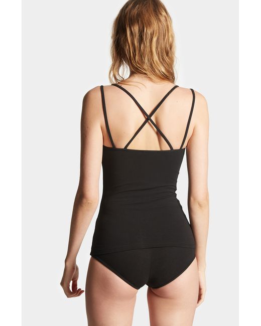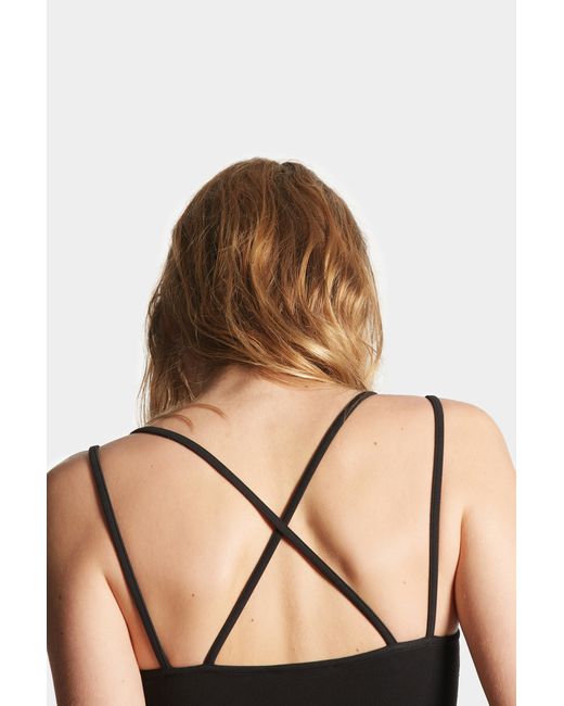 Top in thin stretch cotton jersey with a straight neckline. The adjustable straps split on the shoulders: two continue parallel and two cross on the back. The Icon writing is printed on the front.