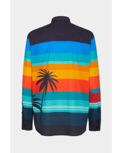 Breezy cotton muslin and a striped print in sunset and ocean hues: nothing says summer like this tropical palm tree shirt. Perfect for city strolls and sundowners by the beach, its oversized silhouette is to be worn strictly untucked.