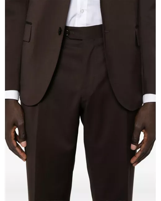 chocolate brown virgin wool Jacket: front button fastening notched lapels brooch detail long sleeves buttoned cuffs chest welt pocket two front flap pockets English rear vents multiple internal slip pockets partial lining Trousers: concealed fly and button fastening belt loops coin pocket two side inset pockets pressed crease two rear button-fastening jetted pockets