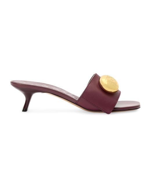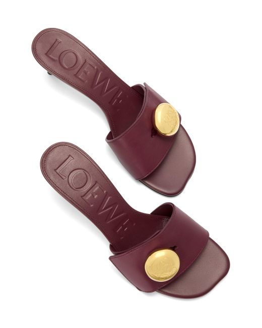 Crafted of leather, the Pebble slides from LOEWE are detailed with a goldtone branded button at the open, petal toe. A sculptural 45mm heel completes this pair. Open toe Slips on Leather upper Leather sole Made in Italy SIZE Heel: about 1.77" (45mm) ABOUT THE BRAND For over 179 years, LOEWE has been synonymous with classic luxury and expertise in fine leather and tailoring. The Spanish house's latest chapter hones in on redefining the craft through an intellectual-yet-playful approach to fashion. The line's bold and vibrant take on the Spanish lifestyle is infused in its effortlessly chic handbags, shoes, ready-to-wear and accessories for women and men. Women's Shoes - French Designer > Loewe > Saks Fifth Avenue > Barneys. LOEWE. Color: Burgundy. Size: 7.