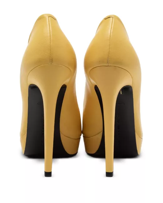 yellow leather upper platform sole stiletto heel round toe leather insole Condition: GOOD. This previously owned and used item is in good condition with minimal signs of use. This may include fading of material or plating and scratches.