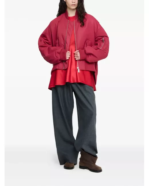 ruby red front zip fastening boxy shape side flap pockets ribbed cuffs back logo patch