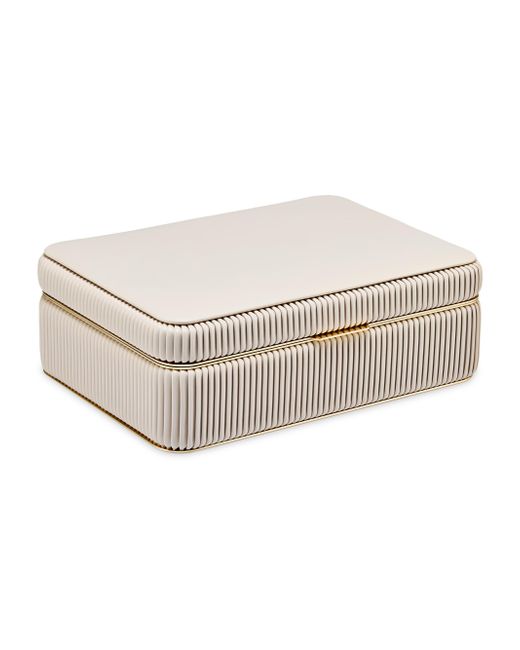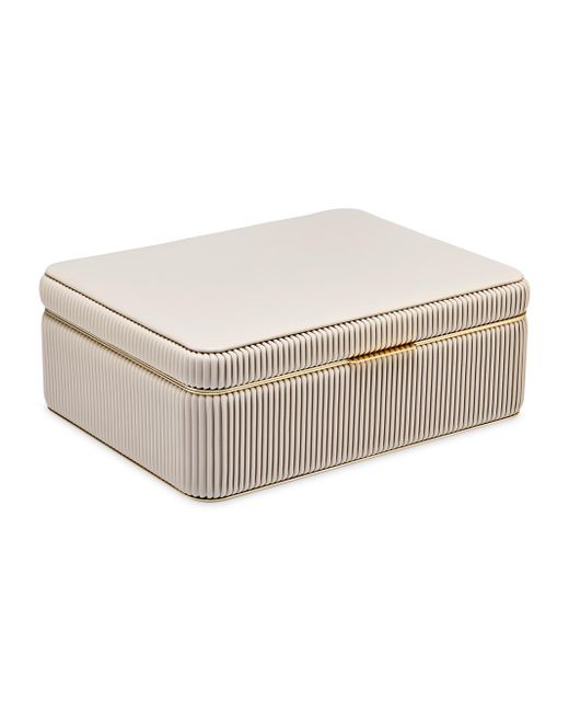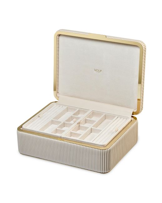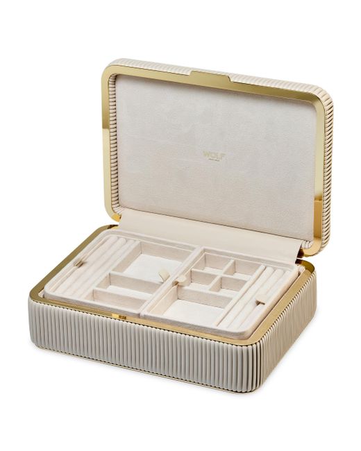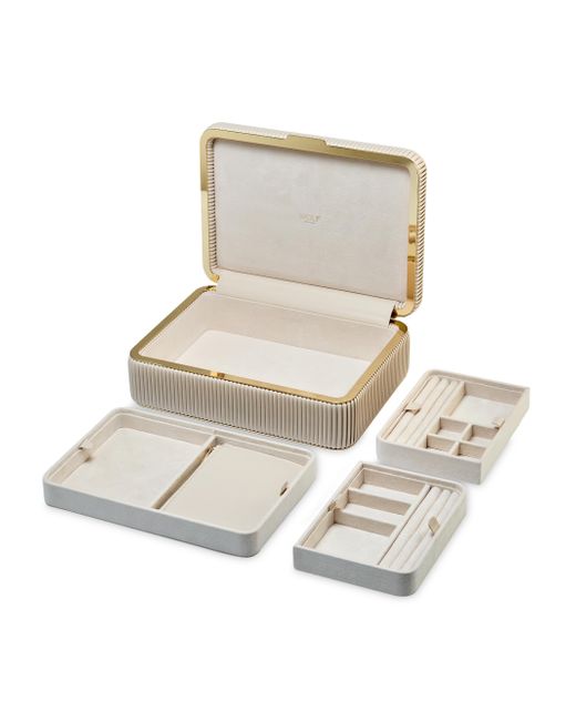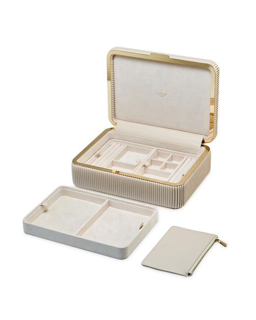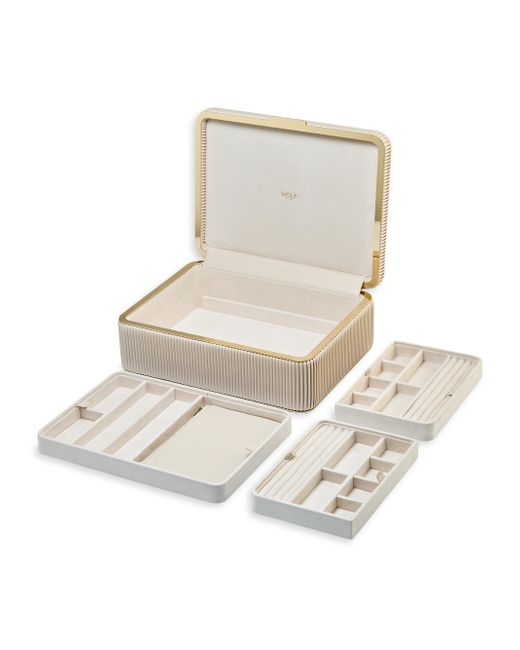 From the Bella Collection. The Bella jewelry box brings opulence and sophistication with a smooth vegan leather lid, perfectly pleated sides, and gold finish interior frame and hardware. Inside, find three lusterloc lined removable jewelry trays with 10 compartments for necklaces, rings, bracelets, and earrings, as well as space for an extremely useful removable vegan leather zip pouch with an interior divider to keep pieces separate and protected. Includes ring roll and removable zip pouch Two removable trays with six small compartments One removable tray with four small compartments and one large compartment Large open storage area under lower tray Faux leather Wipe clean Imported SPECIFICATIONS Medium: about 11"L x 8"W x 3.5"H Large: about 12.5"L x 9.5"W x 4.25"H. Home - Frames And Leather Acces > Wolf > Saks Fifth Avenue > Barneys. Wolf. Color: Bone. Size: Medium.