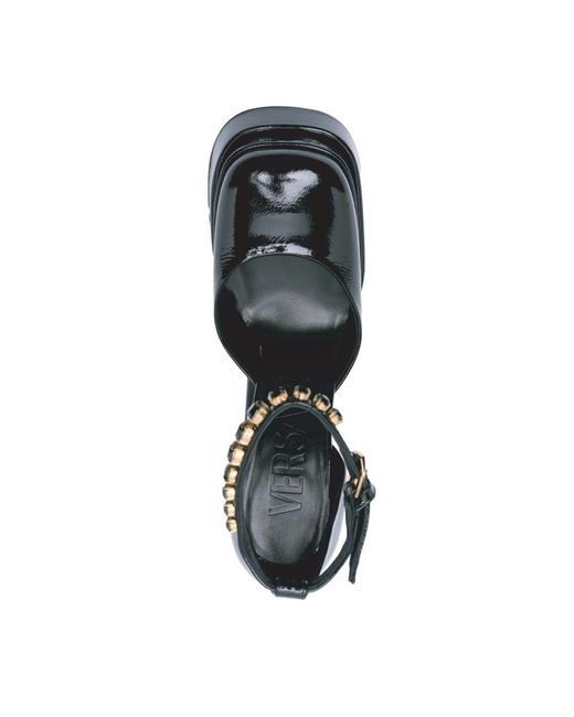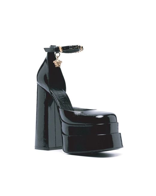 Description: – Composition: 100% calf leather – Patent leather – Leather lining, insole, sole – Ankle side buckle fastening – Round toe – signature Medusa head – Heel 16 cm – Platform 6 cm – Made in Italy –