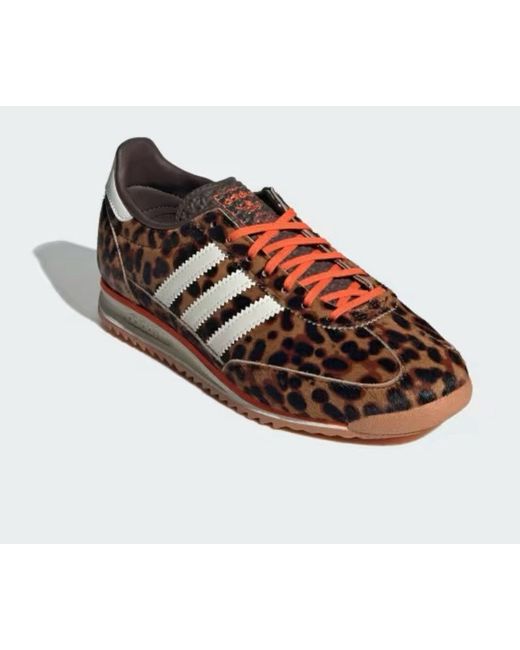 This adidas Originals SL 72 OG trainer in size UK5.5 features a stylish leopard print design in dark brown, off white, and semi-impact orange colours. The shoe is made with a leather and textile upper, with a textile lining for comfort. It boasts features such as arch support, cushioning, slip resistance, lightweight construction, moisture-wicking properties, and breathability, making it ideal for various activities like running, jogging, cycling, and gym training. The rubber outsole provides durability and traction, while the foam insole adds extra comfort for all-day wear.