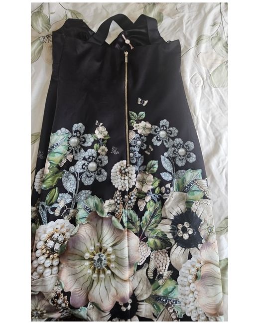 Elevate your wardrobe with this stunning Ted Baker dress in classic black. Perfect for any occasion, this sleeveless bodycon dress is made from a blend of polyester, cotton, and acrylic for a comfortable fit that moves with you. The dress features a knee-length hemline and is designed with elastane fabric type, making it perfect for winter, autumn, summer, and spring. The dress is available in size UK 8 and is suitable for regular size types. It is ideal for weddings, parties, cocktail events, casual outings, and formal business meetings. Make a statement with this beautiful dress that embodies elegance and style.