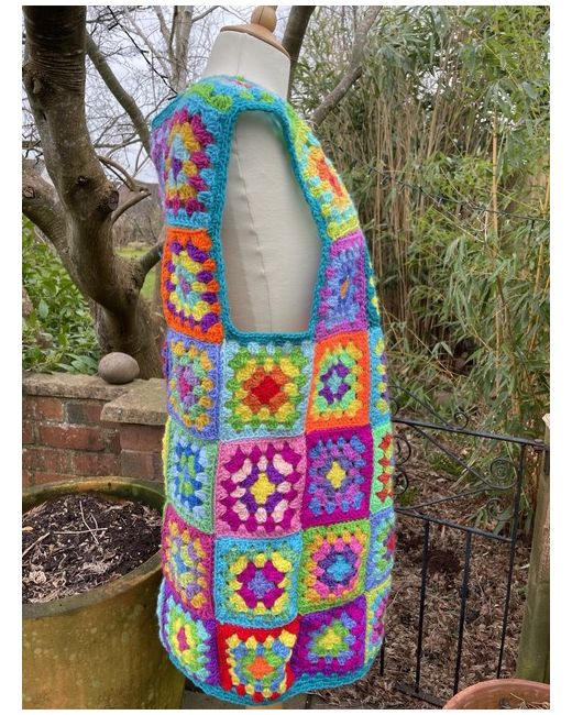 100% of the sale price of this gorgeous waistcoat/jacket will go to The British Red Cross Society. It was handmade by my Mum from new soft acrylic yarn, in really bright and cheerful colours. It’s 22” wide across the chest when laid flat and 31” long, so I guess about a 14-18 but please check the measurements before buying because they all come out different sizes. The mannequin in the photos is only a size 12, so more of the coloured squares will show when the waistcoat is on a larger person. Please see my other listings for more bright and cheerful crochet cardigans, ponchos, gloves and hats. New items are listed frequently and all are for charity.