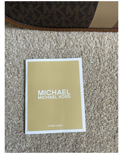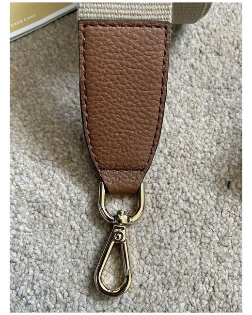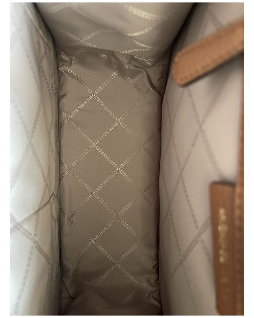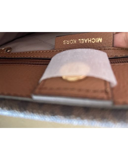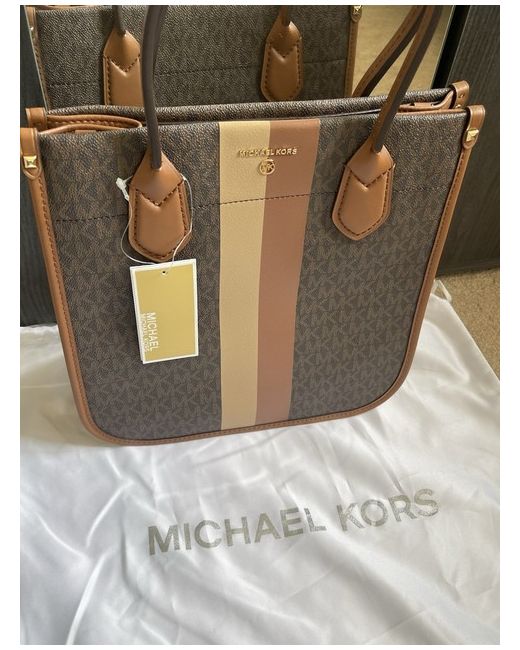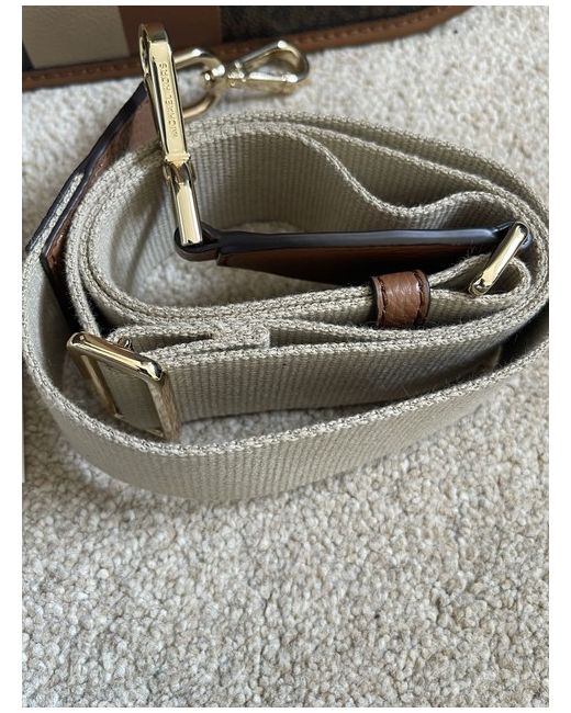 The bag features a signature logo pattern on the exterior, made of canvas material and leather in a brown colour.