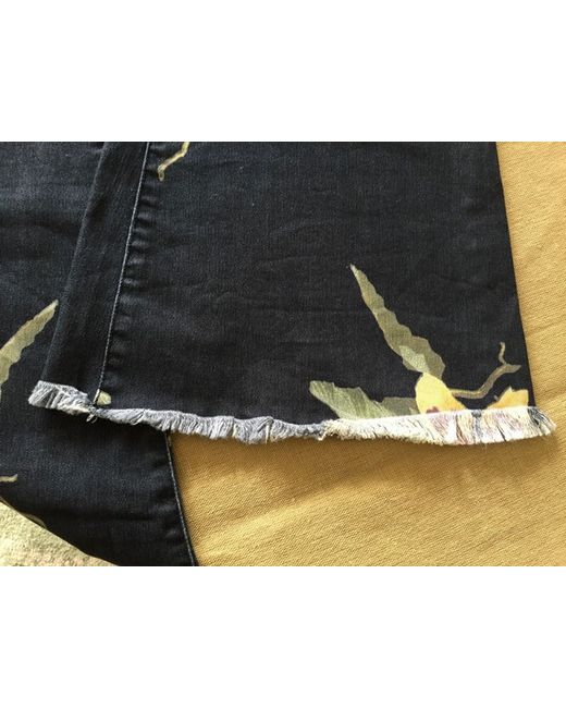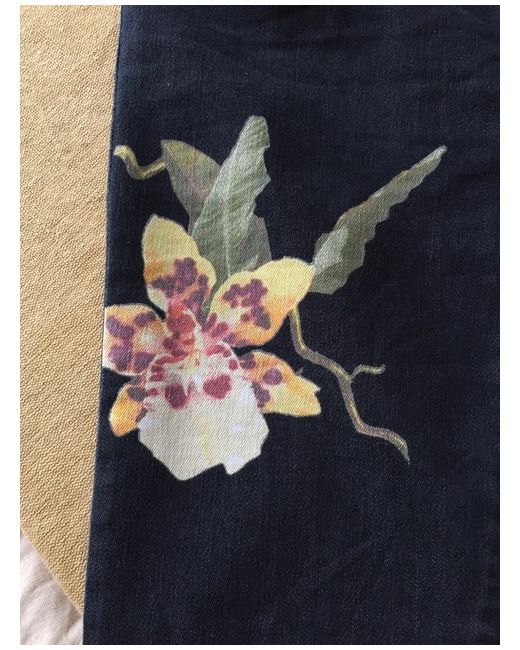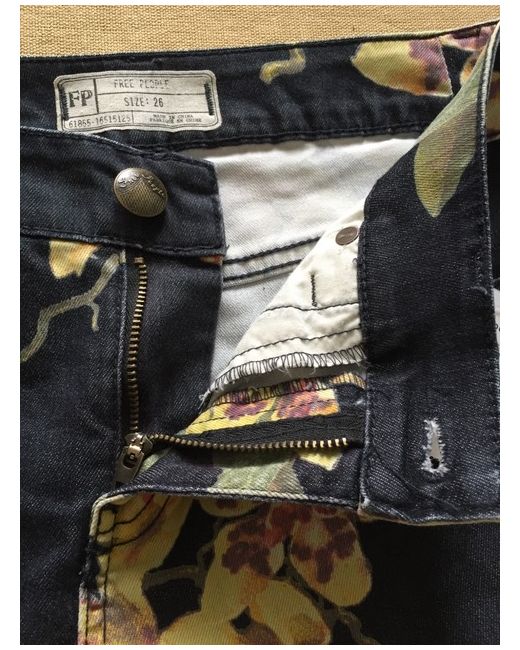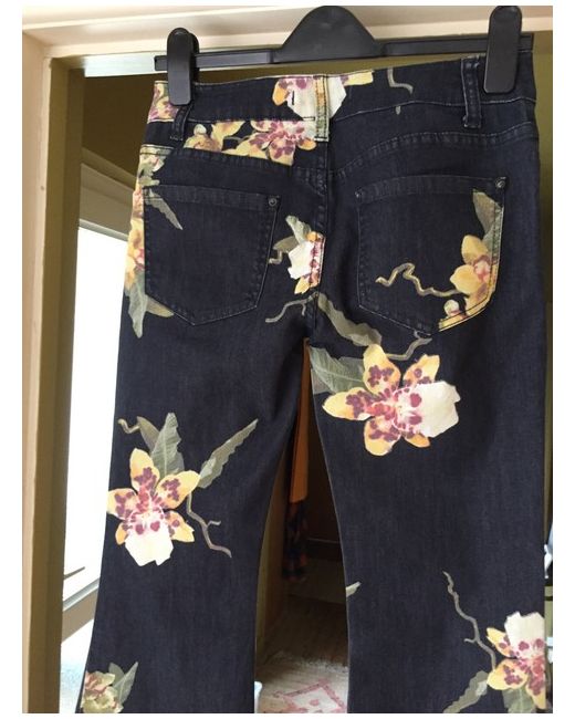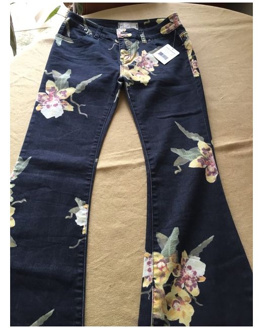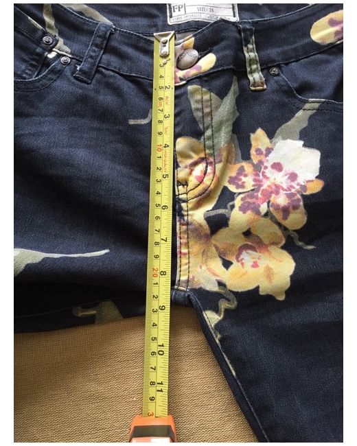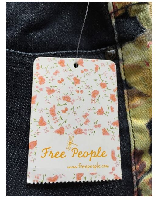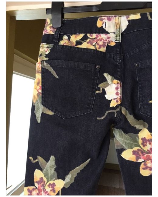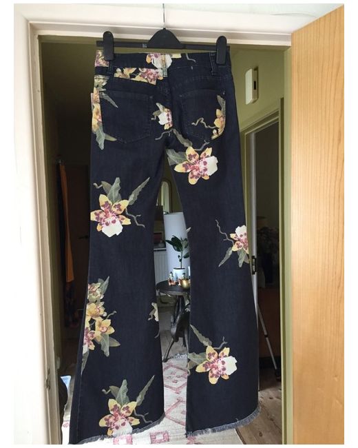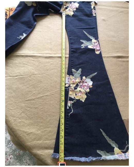 Fabulous Free People trailing flower orchid patterned denim flared low rise jeans. Raw hems. Button and fly fastening. 2 back patch pockets. BNWT Size 26” Waist. Please see photos for details and garment measurements (some stretch in the material).