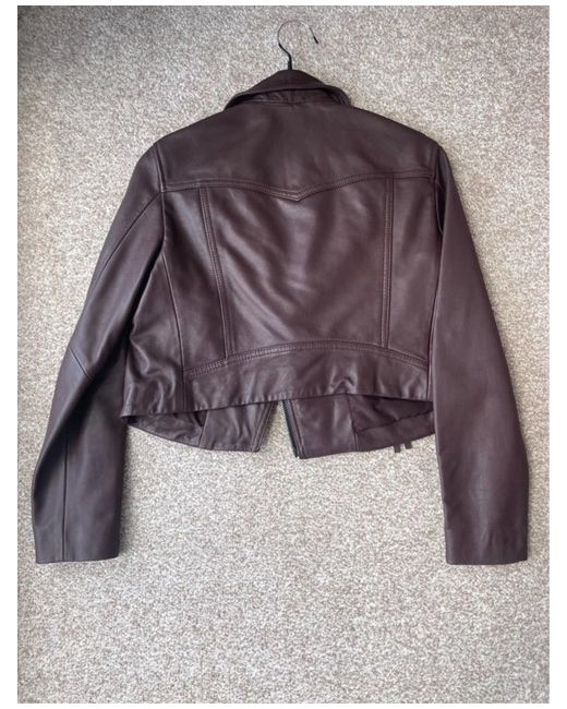 This is a women's black leather jacket in size 10 by All Saints. The cropped biker style jacket is designed in a striking burgundy colour, offering a unique and edgy look. Made from high-quality leather, this jacket is perfect for adding a stylish and rebellious touch to any outfit. With a regular fit, this jacket is a versatile piece that can be worn year-round for a chic and fashionable appearance.