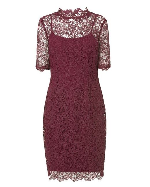 LK BENNETT DARK RUBY RED SASHA DRESS SIZE 10. No wardrobe is complete without a touch of lace; this timeless design from L.K. Bennett offers a chic, body-contouring silhouette for all your parties and evenings out this season It's crafted from an intricate floral lace with a lining to the body and sheer detail at the neckline and sleeves Intended to finish at the knee, this piece offers a sophisticated look when partnered with open-toe heels and a tailored coat to cover up Colour: Ruby Composition: 100% Polyester, Lining: 100% Polyester Care: Dry clean
