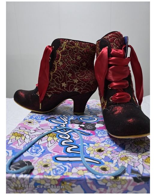 The Irregular Choice Chinese Whispers ankle boots in UK size 7 and EU size 40 feature a round toe, lace-up closure, glitter accents, scalloped detailing, and embroidered embellishments. The vintage red boots with a kitten heel are perfect for women looking to add a touch of 30s or 40s style to their outfit. Made from synthetic upper material and fabric lining, these booties are a stylish choice for the autumn, summer, and spring seasons.