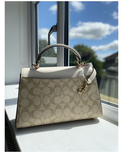 This Coach Cream Handbag is a stylish and versatile accessory for casual occasions. Made from luxurious leather in a cream exterior, it features a beige leather handle/strap and gold hardware accents. With a medium size and shoulder bag style, this designer handbag exudes a sophisticated touch perfect for adding a touch of elegance to any outfit. A timeless piece from the Coach brand, this handbag is a must-have for any fashion-forward woman looking for a statement accessory.