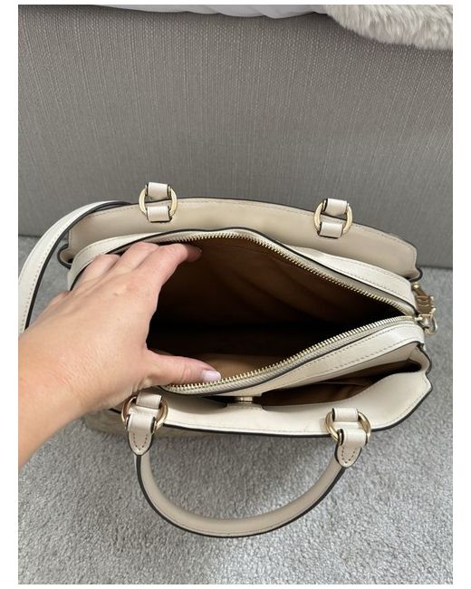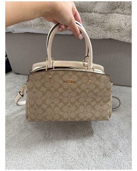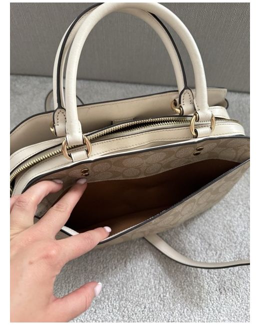 The Coach Bag is a medium-sized crossbody handbag made from beige leather with gold hardware accents. It features a zip closure and inner pockets for organised storage. Perfect for casual occasions, this designer bag from Coach is ideal for women looking for a stylish yet practical accessory. The brand's signature quality and attention to detail make this bag a versatile and fashionable choice for everyday use. Bag was used once and as shown there’s a mark inside the bag