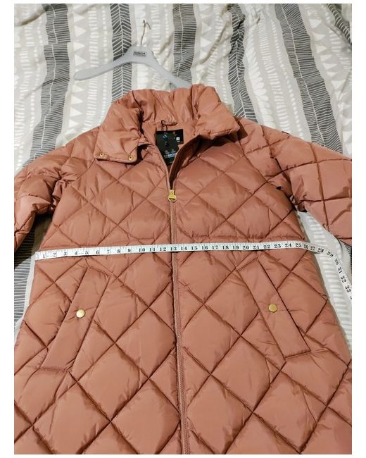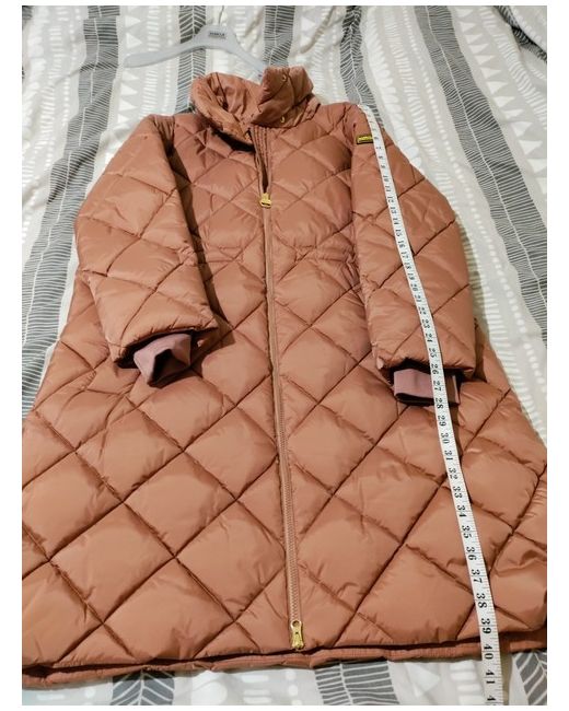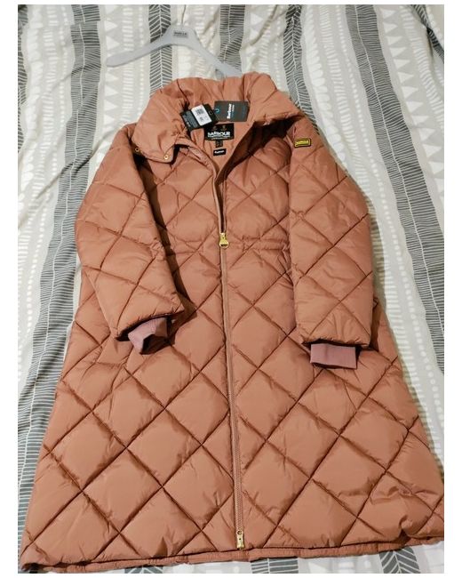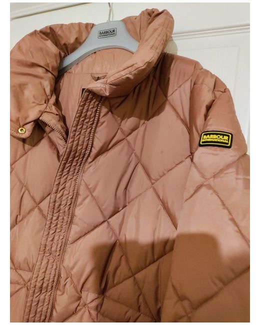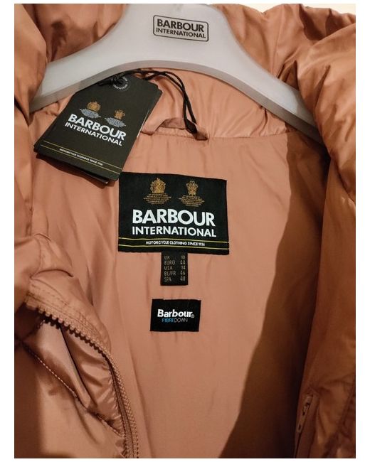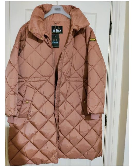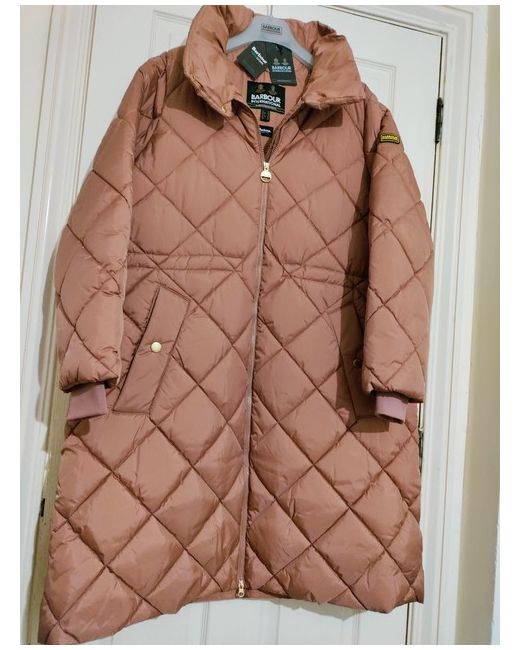 This Barbour International winter jacket is a must-have for any fashion-forward woman. The long quilted design, full-zip closure, and pink colour make it perfect for any occasion, whether it's a party, casual outing, formal event, or business meeting. The jacket is made of microfibre fabric, with accents of a zip and logo, and lined with polyester. The outer shell material is polyester, and the insulation material is polyester as well. It has long sleeves and is machine washable. This jacket is part of the Barbour International collection, with a designer, princess, outdoor, classic, and retro theme. It is available in a size UK 18 EU44 and is a regular fit. The jacket is perfect for the winter season and can be worn by women who love to stay warm and stylish.