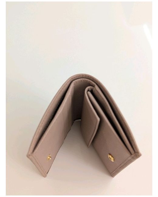 Snap fastener Enameled metal triangle logo One bill compartment Three card slots Two internal pockets Internal coin pocket with flap Moire and Saffiano leather lining h. 11.2 cm w. 8.5 cm Brand New Made in Italy