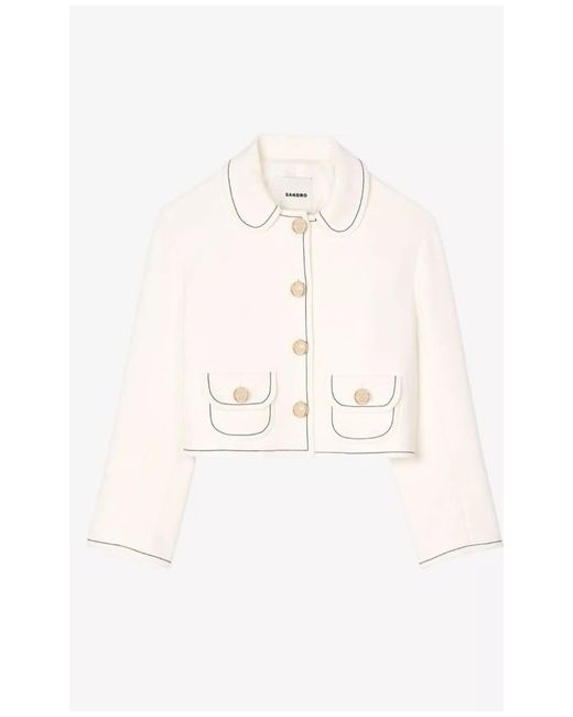 This beautiful Sandro white jacket with black thread is a stylish and versatile addition to any wardrobe. Made from polyester with a cropped length, it features a classic fit. The ecru colour and button accents add a touch of elegance, perfect for casual occasions in the summer and spring seasons. Lined for added comfort, this jacket also includes pockets for convenience. Ideal for women size 8, it comes with all tags and spares, making it a practical and fashionable choice from the Parisian brand Sandro.