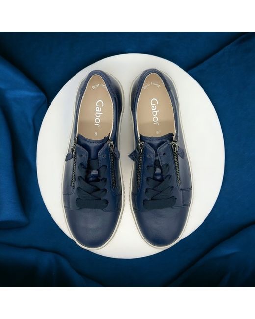 Gabor Wisdom classic sneakers with full grain soft leather upper and removable insole, lace fastening, and twin zip. This is a great trainer for dresses or casual jeans. Wisdom offers an on trend comfortable sneaker with a round toe shape and neat profile. Full grain soft leather upper Standard F fitting ' C width in UK fittings' Lace up Leather lining Twin zip 35 mm flat heel Cushioned rubber cream sole Removable insole Colour 26 TS-POTB-LT5A