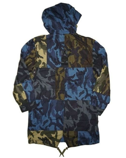 DIESEL J-DRONE JACKET. Long jacket in camouflage. logo details, zip and snap fastenings, drawstrings on hood, waist and hemline. snap flap pockets at front. 100% Cotton. shoulder to shoulder - 48cm.